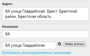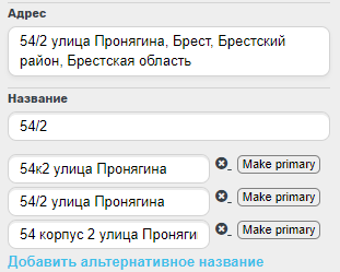 - Для номера с буквой добавляем альтернативное название в виде Номер улица Название