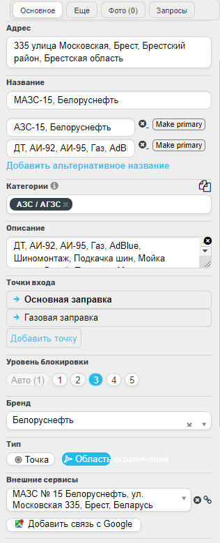 - При наличии на АЗС автосервиса или автомойки данные типы добавляем отдельно, указывая в их названии принадлежность АЗС.
