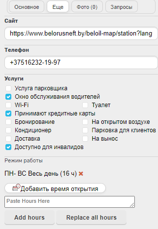 - Заполняем дополнительную информацию (сайт, телефон, доп. услуги, время работы)