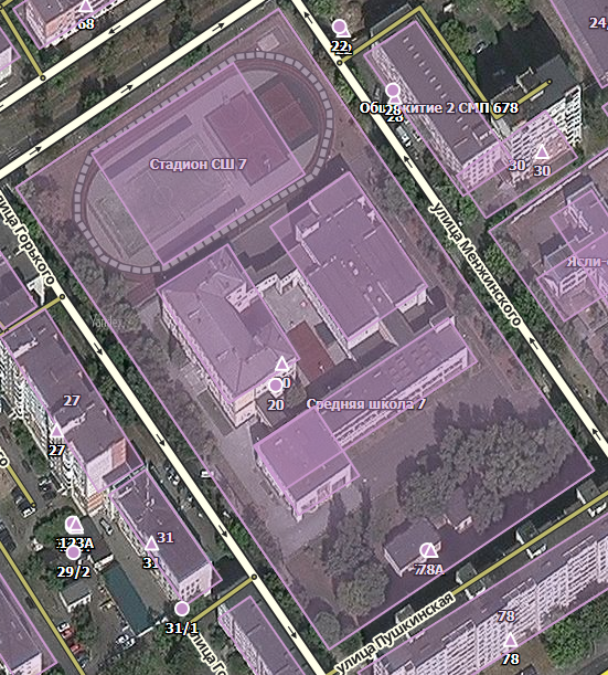 Важно понимать, что школа это комплекс зданий и сооружений ограниченных какой-то территорией. Данное утверждение будет справедливо для детских садов, больниц. Поэтому правила создания данных типов пои будут похожи.